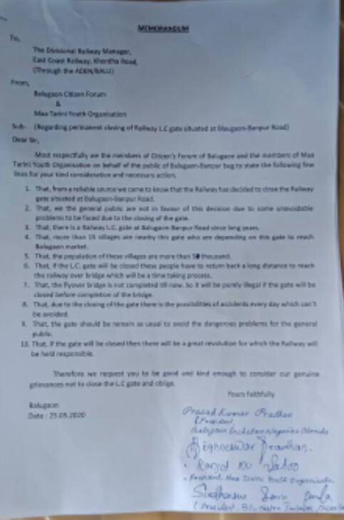 ମା ତାରିଣୀ ଯୁବଗୋଷ୍ଠୀ ଓ ସଚେତନ ନାଗରିକ ମଞ୍ଚ ର ସଦସ୍ୟ ଓ ଆଖପାଖ ଅଞ୍ଚଳର ଲୋକେ ଦସ୍ତଖତ ସହ ନିଜର ଦାବି ଉପସ୍ଥାପନ କରିବାରୁ ପରିଶେଷରେ ବିଭାଗୀୟ ରେଳ କର୍ତ୍ତୃପକ୍ଷ ମାତ୍ର ୧ ମିଟର ପ୍ରସସ୍ଥ ରାସ୍ତା କେବଳ ଚଲାପଥ ଛାଡିବାକୁ ରାଜି ହୋଇଥିଲେ।